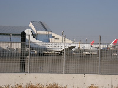 駅前には環状八号線が通っていますが、建物は少なく、人通りもまばらです。近くの空港敷地内には、YS11が止まっていました。