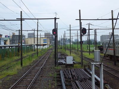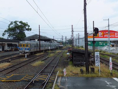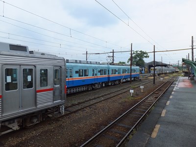 3番線のさらに裏手は熊本電鉄の車庫になっていて、たくさんの車両が留置されています。