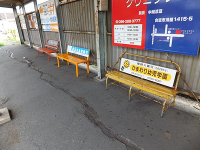 古びたベンチですが、背もたれの広告は新しいものが貼られています。
