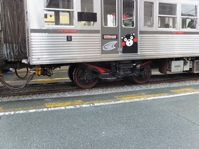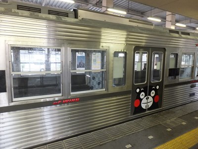 くまモン電車とされた編成はこのようにカラーリングが大きく変更され、グレーを基調としたラッピング塗装となりました。