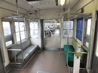 座席のモケットは部品不足からか一部の柄が異なっています。古い車両なので、吊り手は座席の前にのみあります。