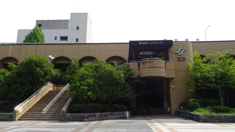 森林公園側から見ると駅舎は2階にある。公園の景観と調和させるためか、レンガ調のタイルで全面を装飾している。