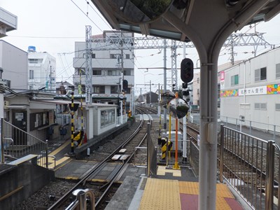 巴町口の改札と駅事務室は道路からは少し奥まったところにある。上写真に見える駅入口の建物は駅前で営業しているたこ焼き・タイ焼きの店である。