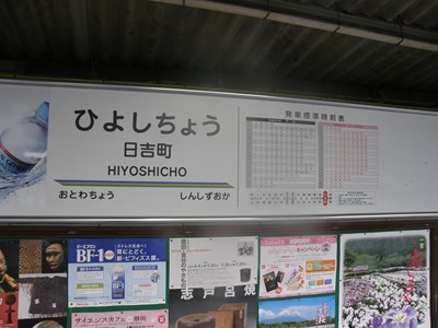 左:県総合運動場駅駅名標 右:日吉町駅駅名標