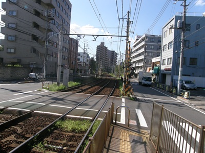 三ノ輪橋方面ホームから早稲田方面ホーム なぜだかわかりませんが、踏切二つ分ホーム同士の間が空いています。
