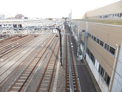 南側に向かってすぼまっていく形になっています。左側奥には大江戸線列車牽引用の機関車、E5000形の姿が見えます。