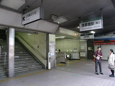 浅草橋は都営浅草線とJR総武線の乗換駅です。駅の周辺は人形・衣料品などの問屋が集まるエリアで、浅草線の駅には「人形の久月 久月総本店前」という副駅名が付けられています。