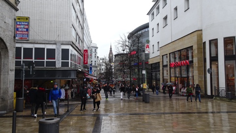 駅舎を背にして左がヴッパータール(エルバーフェルト)の中心市街地、右がDBのヴッパータール中央駅。駅前の通りは歩行者専用道路で、沿道には商店が多く人で賑わっている。