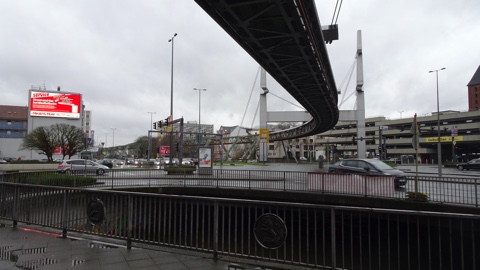 駅の北側(3枚目)はバーメンの中心市街地で、他の方向も市街地が広がる。駅の西側は川の上が幹線道路同士の交差点になっており、川に蓋がされている。その交差点の上を空中鉄道は斜張橋で一気にまたぐ。
