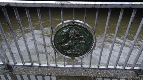 駅前の欄干にはライオンをあしらった円形のレリーフが入っている(「駅周辺」の3枚目写真にも確認できる)。