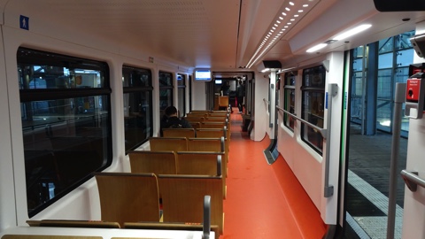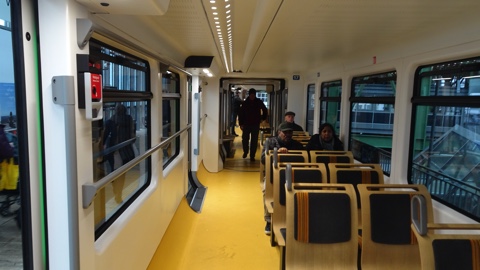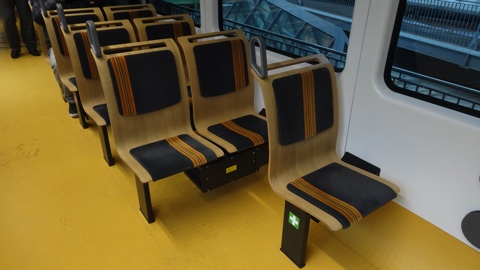 座席は木製のモダンなデザインで、座面と背もたれにはモケットが張られている。進行方向が固定なこともあり、鉄道というよりバスのような形状。
