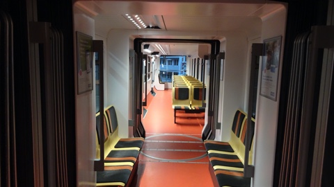 3号車の内装は1号車とほぼ変わらない。1号車の写真と見比べて分かる通り、床とモケットのアクセントカラーは編成によって異なる(他に緑色の編成もある)。