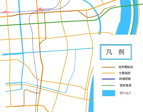 錦糸町駅の南東側にあった錦糸堀電停から荒川西側にあった西荒川電停までを結んでいたのが小松川線で、錦糸堀〜亀戸九丁目間の併用軌道区間は国道14号線(京葉道路)の一部に、亀戸九丁目〜西荒川間の併用軌道・新設軌道は主に生活道路に現在は変わっています(ただし、地図中の点線部は区画整理により消滅)。