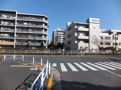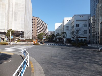 S字カーブを抜けると交差点があります。この交差点の先は区画整理されており、廃線跡がなくなっています。病院の敷地を横切るように廃線跡は伸びていました。