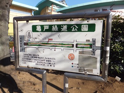 廃線跡は亀戸緑道公園という公園になっています。看板には少しだけ都電についての言及もあります。