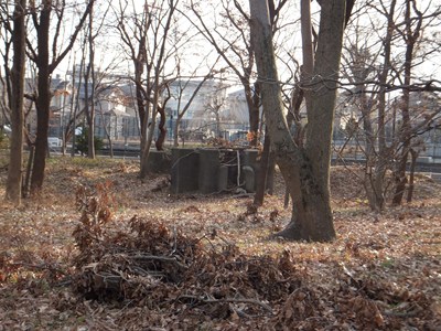 林の中にはコンクリートでできた構造物があります。この場所では羽村から運んできた土砂を破砕選別していました。この構造物は土砂を貨車に積むためのホッパーの跡とされています。