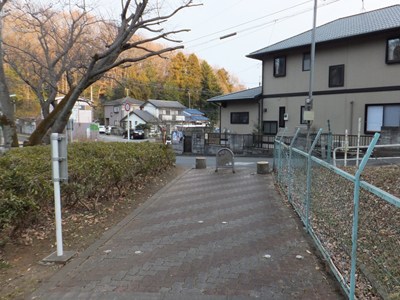 しばらく進むと再び住宅地の中に入ります。この付近で少しだけ、廃線跡が自転車道と離れます。写真の丁字路を左に曲がると再び廃線跡に出られます。