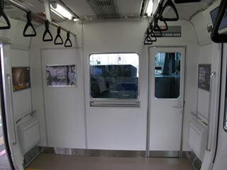 貫通路の扉窓は大きく、毒ガステロなどに備えて全車両間に2枚の貫通扉が設置されています。