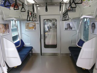 車内です。京葉線205系にも通じるところがある寒色系のモケットが採用されています。