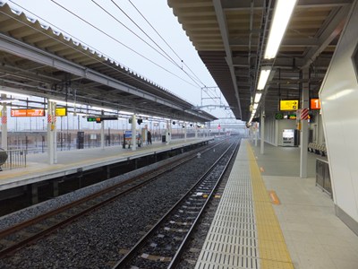 島式2面3線のJR型配線で、中線は非常時の折り返し用です。ホームは白を基調とした明るいデザインです。
