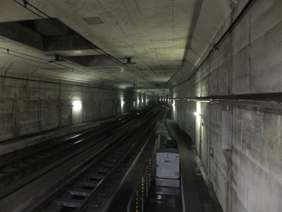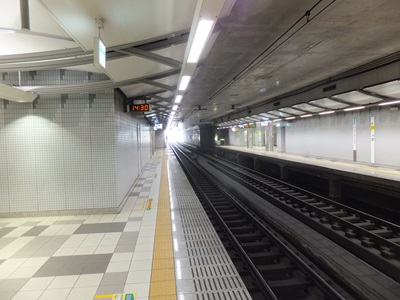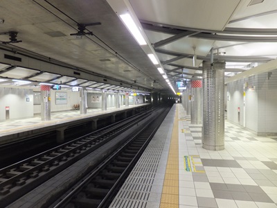 相対式ホーム2面2線の線路配置で、土被りが浅く柱が少ないこともあって他の地下駅とは印象が異なる。