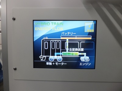 機器室の部分に車内LCDが設置され、常にエンジン・バッテリー・モーターの間の電気の流れを表示している。個人的にはこの部分で次駅表示や所要時間の案