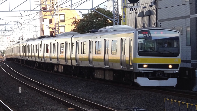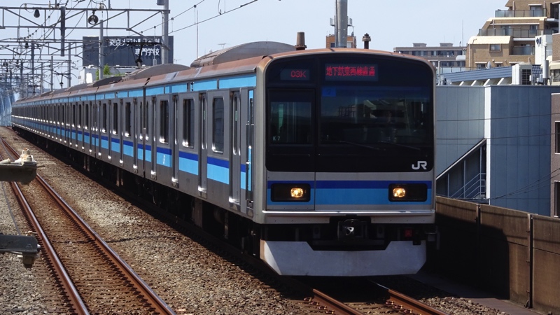| E231系800番台 | 東西線乗り入れ用の車両で、帯色が東西線に合わせて濃淡の青だったり車体が裾絞りのない幅の狭い構造だったりと、0・500番台とは大きく異なる。総武線区間では西船橋〜津田沼間でしか営業運転をすることはなく、時間帯も平日の朝夕ラッシュ時に限られている。 |