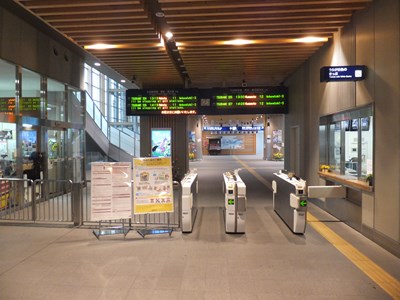 相対式2面2線の線路配置を持つ高架駅で,ホームなど柱の一部に木が使用されるなど,ぬくもりを意識した意匠が施されています。