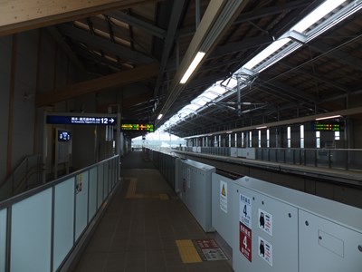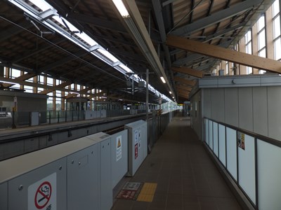 相対式2面2線の標準的な線路配置ですが,ホームの柱の一部が木材で覆われている(あくまで鉄骨造で,木質構造ではない)のが特徴です。