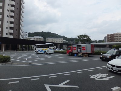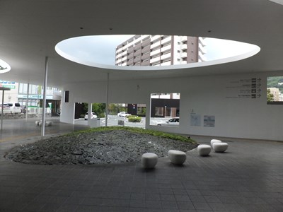 西口ロータリーは歩道と車道の間に変わった意匠の防風壁が設けられています。