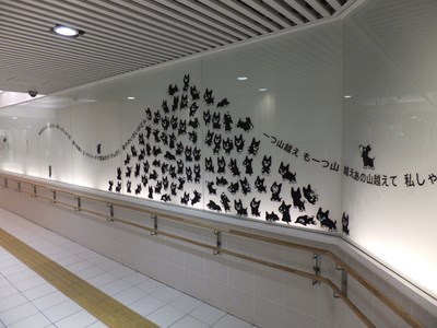 東口に向かう改札外の地下通路は白を基調とした明るい色合いで,壁には「くろちゃん」が描かれています。(東口の様子は熊本駅(在来線)を参照)