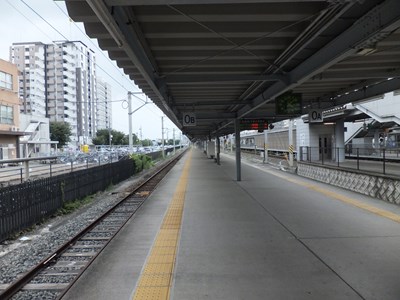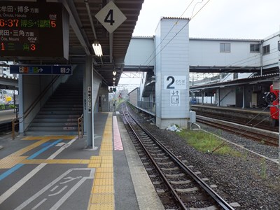 2番線は1番線と互い違いの位置にある単式ホーム(1番線側にも面しているものの壁で仕切られています)で,2番線ホームへは跨線橋を通る必要がありま