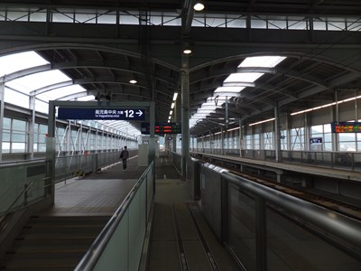 相対式2面2線の線路配置の高架駅ですが,下り12番線の向かい側には保線用の線路があり,島式ホームのようになっています。この保線用側線は博