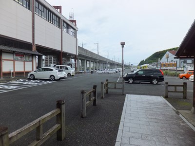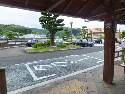 東口側には大きな駐車場があります。駐車場から駅への入り口も和風です。