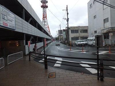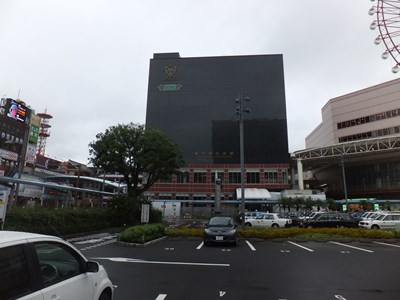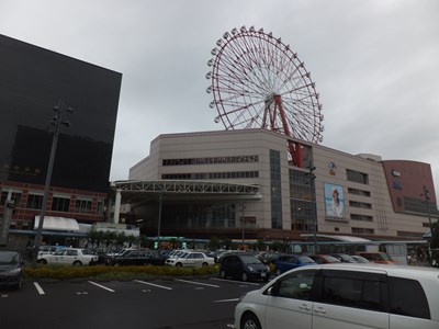 ており,向かって左の黒い建物が駅出入口の入っているプレミアム館(探訪当時は建設中でしたが,すでに完成しています)で,右の観覧車のあるビルが駅に隣