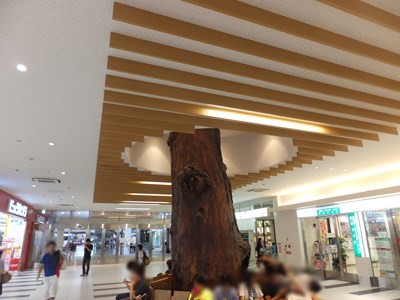 西口の中には大木の幹のモニュメントが置かれています。新幹線の高架下にはビッグカメラが入居しています。