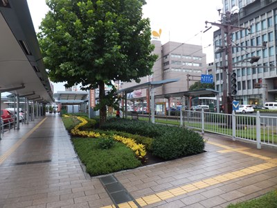 駅前は大きなロータリーになっており,ロータリーの道路側には鹿児島市電の停留所もあります。
