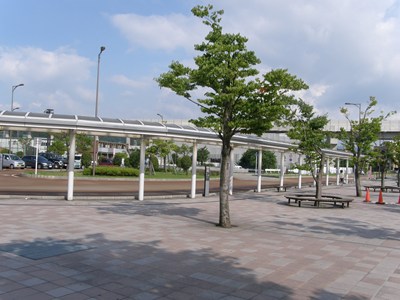 駅前にはロータリーがあります。駅の周辺は北陸線の移設に伴って再開発が行われていて、大型の商業施設などが出店しています。