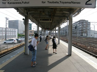 島式1面2線の橋上駅で、ホームの横まで金沢貨物ターミナル駅の線路が伸びています。2002年までは現在よりも南側にありましたが、北陸新幹線の工事のために線路ごと現在地に移設されました。