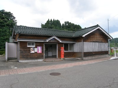 木造の駅舎で、破風の部分には勢いのある書体で駅名が書かれています。