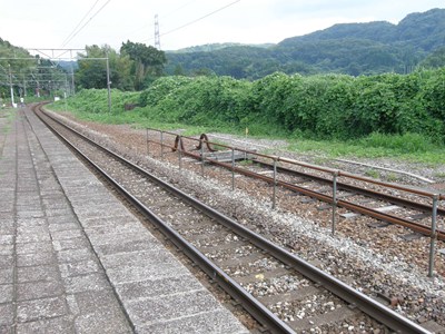 上り線側の側線には貨物ホームの跡もありますが、上下ともに側線は金沢側でしか本線とつながっていません。