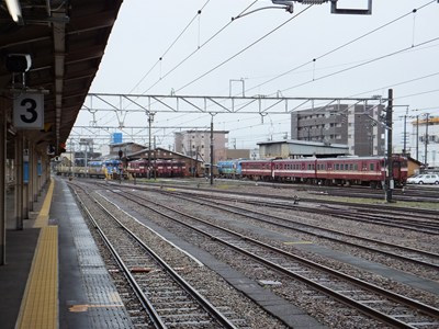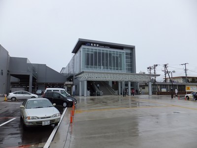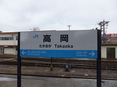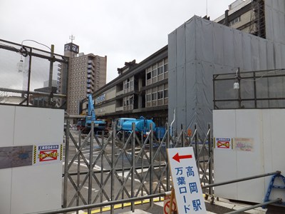 島式・相対式4面7線の線路配置で、中央の2面4線を北陸線が、北側の1面1線を氷見線が、南側の1面2線を城端線が使用しており、他に支線2路線の車庫や貨物側線が併設されています。駅舎は橋上化工事中で、既に改札は移設され、現在は北口駅舎の建て替えが行われています。駅周辺は市街地ですが、少し寂れた雰囲気が出ています。