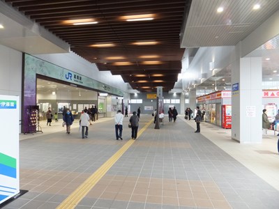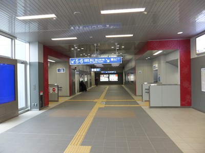 自由通路は明るい開放的な作りで、改札付近は変わったデザインです。突き当りは北口になる予定で、現在は工事中のため閉じられています。