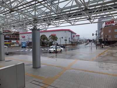 東口は建て替え中の北口に代わって使われている臨時駅舎で、工事開始前までは氷見線ホームがあったところにあります。駅前はタクシー乗り場などになっており、北側のビル(写真の茶色い建物)の裏を通れば北口に出られます。