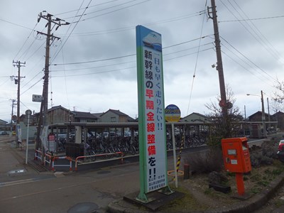 北陸線沿線に点在する、E2系をイメージした新幹線促進看板です。
