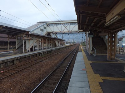 駅舎側が金沢方面のホーム、跨線橋を渡った先が富山方面のホームとして使用されています。中線は退避用です。