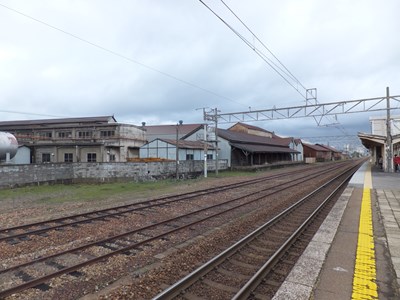 駅の裏手には貨物側線があります。駅の裏側は日本電工の工場ですが、そこには貨物ホームの跡(写真中央)も見えます。