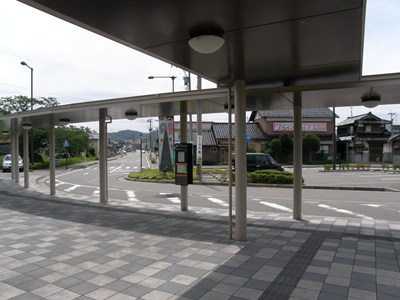 駅前はロータリーが整備され、バス停もあります。津幡町の中心街はもう少し南側(この写真の向いている方向)にあります。