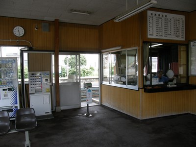 駅舎内は待合室として活用されています。自動券売機もありますが、有人駅なので駅員さんから直接切符を買うこともできます。
