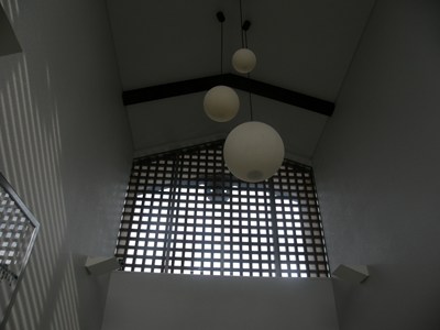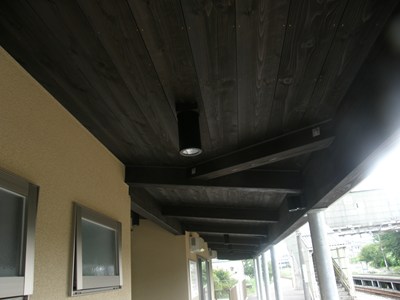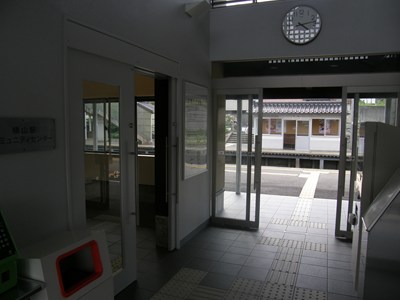 駅舎の真ん中に通路があり、ホームに向かって奥が改札、右がトイレ、左が待合室という形です。屋根の辺りや壁の色は武家屋敷を意識しているのでしょうか。照明が特徴的です。